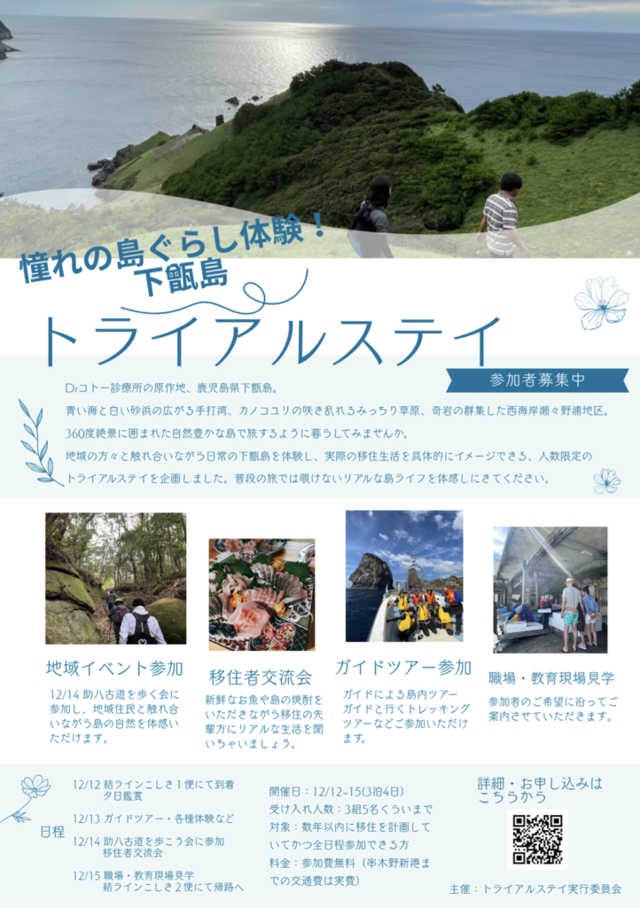 移住希望者の方に下甑島に実際に滞在しながら、さまざまな経験をして頂き、リアルな移住生活を体験し、移住に繋げてもらおうという企画です。