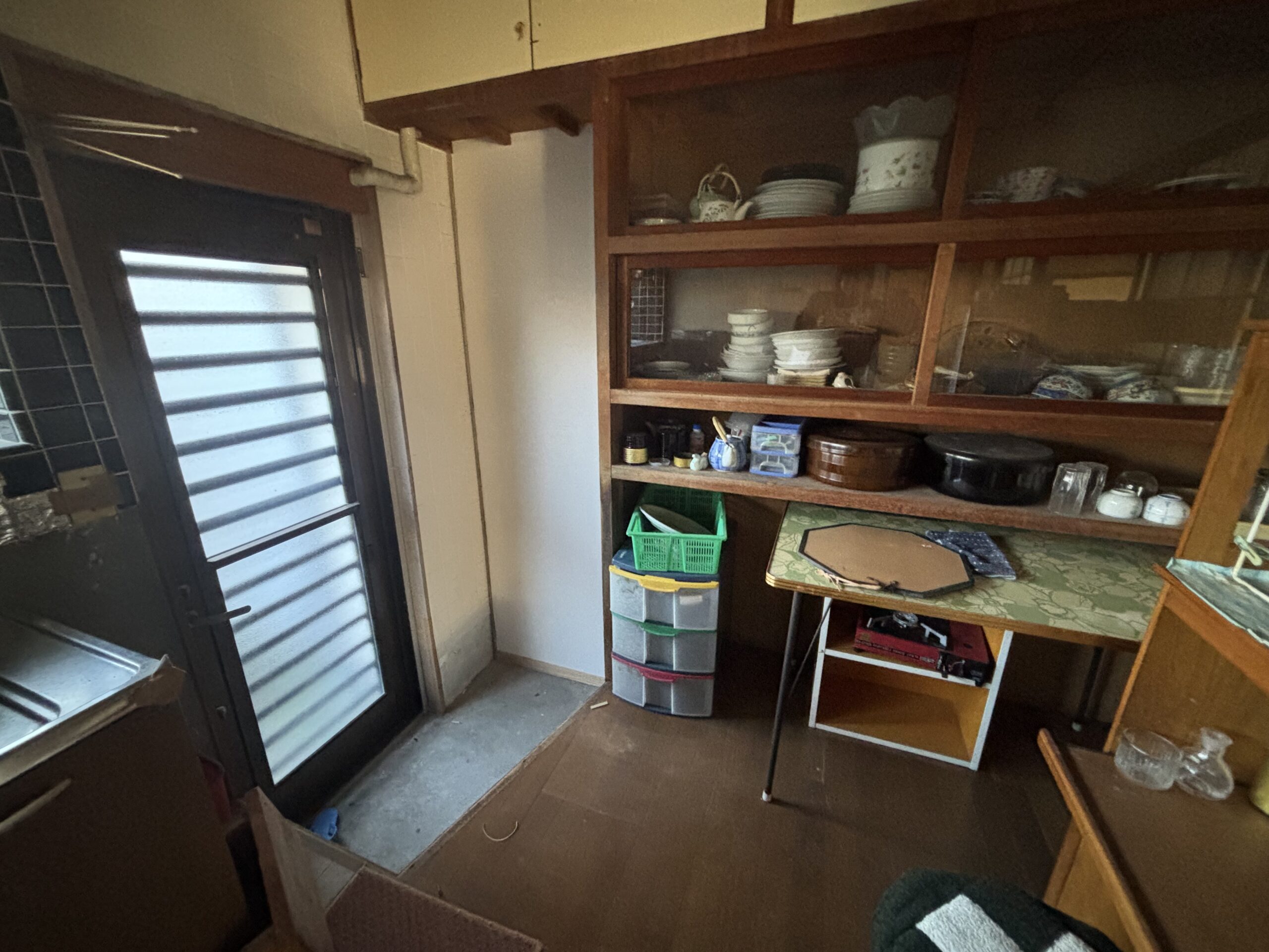キッチンの出窓部分はちょっとした道具置きにも活用できます。勝手口が付いているため、ゴミ出しや外への出入りもスムーズに行えます。